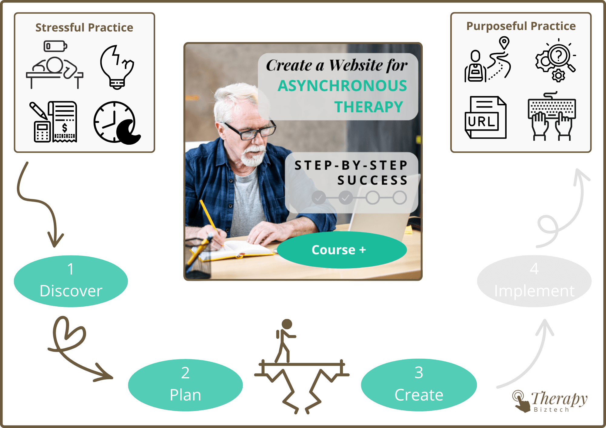 You’ve finished Plan your Site with the Therapy Website Design Formula. Now use that plan to actually build a website that delivers an online curriculum + therapist consultation — so your practice can run more flexibly, reach the right clients, and produce consistent clinical results. Experience step-by-step success with help from Therapy Biztech.
